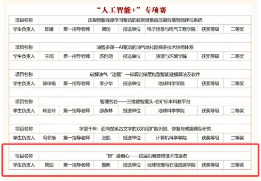 (通讯员 刘筱蔓)近日,第十九届“挑战杯”全国大学生课外学术科技作品竞赛“人工智能+”专项赛结果揭晓。长江大学地球物理与石油资源学院博士生周迎领衔的团队,凭借参赛作品《“智”绘岩心——纹层页岩建模技术攻坚者》,荣获全国三等奖,为学校赢得荣誉。