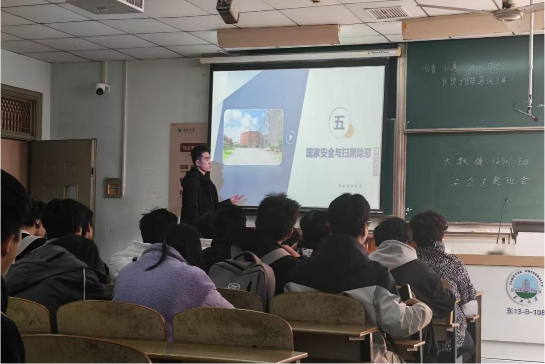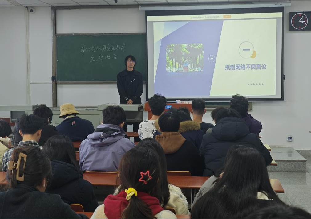 班会内容涵盖网络安全、交通消防与食品安全、防范非法金融活动、防诈骗教育以及禁毒宣传五大板块。其中,在网络安全部分,班会结合宪法、刑法等相关法律法规,通过大学生因网络不当言论受处分、涉辱华言论影响公职录用等真实案例,引导学生自觉抵制网络谣言与不良信息,文明上网、规范言行。