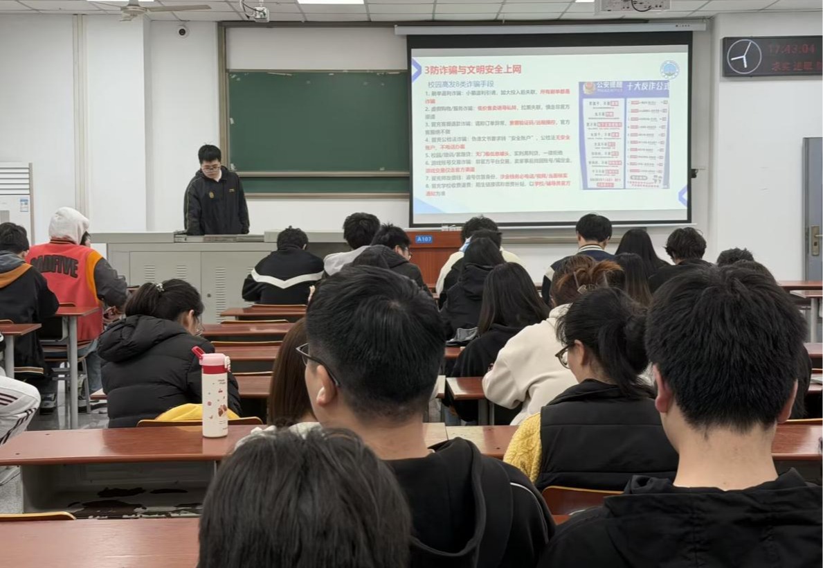 班会进一步强调,全体同学要牢固树立“安全第一”的思想,切实履行个人安全责任。要筑牢财产安全防线,面对各类诈骗信息,坚持做到不轻信、不泄露、不转账、不参与;要严守网络行为底线,坚持依法上网、文明上网、理性上网,自觉维护清朗网络空间;要积极发挥朋辈引导作用,从自身做起,关心身边同学,互相提醒督促,共同营造安全、文明、和谐的校园环境。