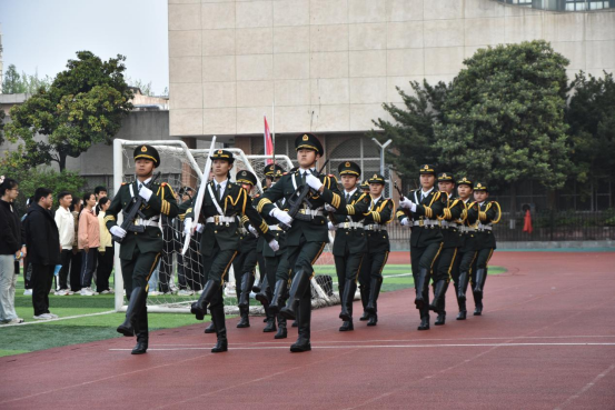 晨光初现,春风和煦。国旗护卫队步伐铿锵,护送五星红旗至升旗台。全体师生肃立注目,齐唱国歌。五星红旗在激昂的旋律中冉冉升起,迎风飘扬。