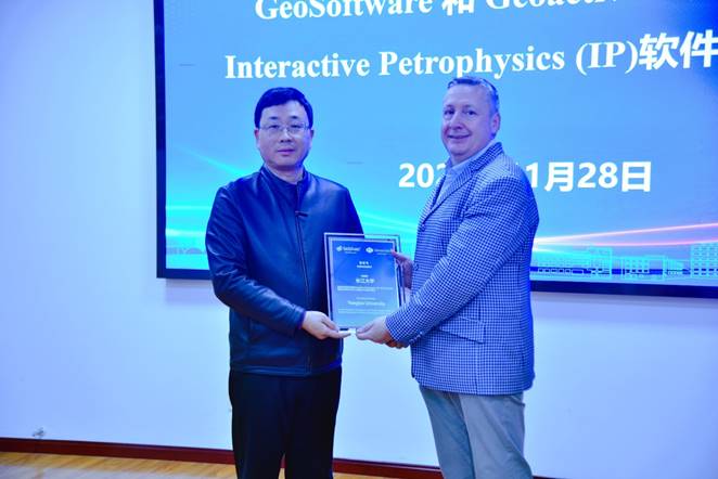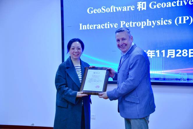 仪式上,地物学院副院长向葵代表学院接受了由Geoactive总裁Derek Crombie颁发的Interactive Petrophysics(IP)软件授权证书。随后,社会合作处副处长吴浙向Derek Crombie总裁颁发了捐赠证书,表达校方对Geoactive公司慷慨支持的诚挚感谢。