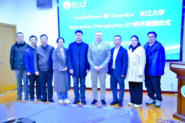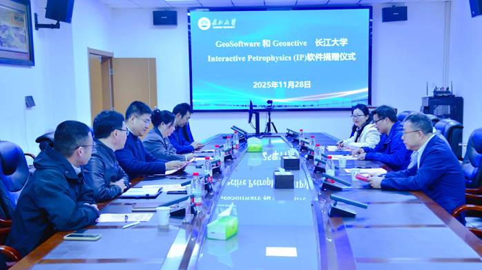 (通讯员 余为)11月28日上午,GeoSoftware & Geocive公司与长江大学地球物理与石油资源学院软件捐赠仪式在武汉校区隆重举行。学院常务副院长赵彬主持仪式。Geoactive总裁Derek Crombie、GeoSoftware中国区总经理贺新蔚、Interactive Petrophysics(IP)技术支持张晓岗、市场专员刘丹,以及长江大学社会合作处副处长吴浙、地物学院副院长向葵、测井信息工程系主任蔡明与副主任申波副教授等共同出席。