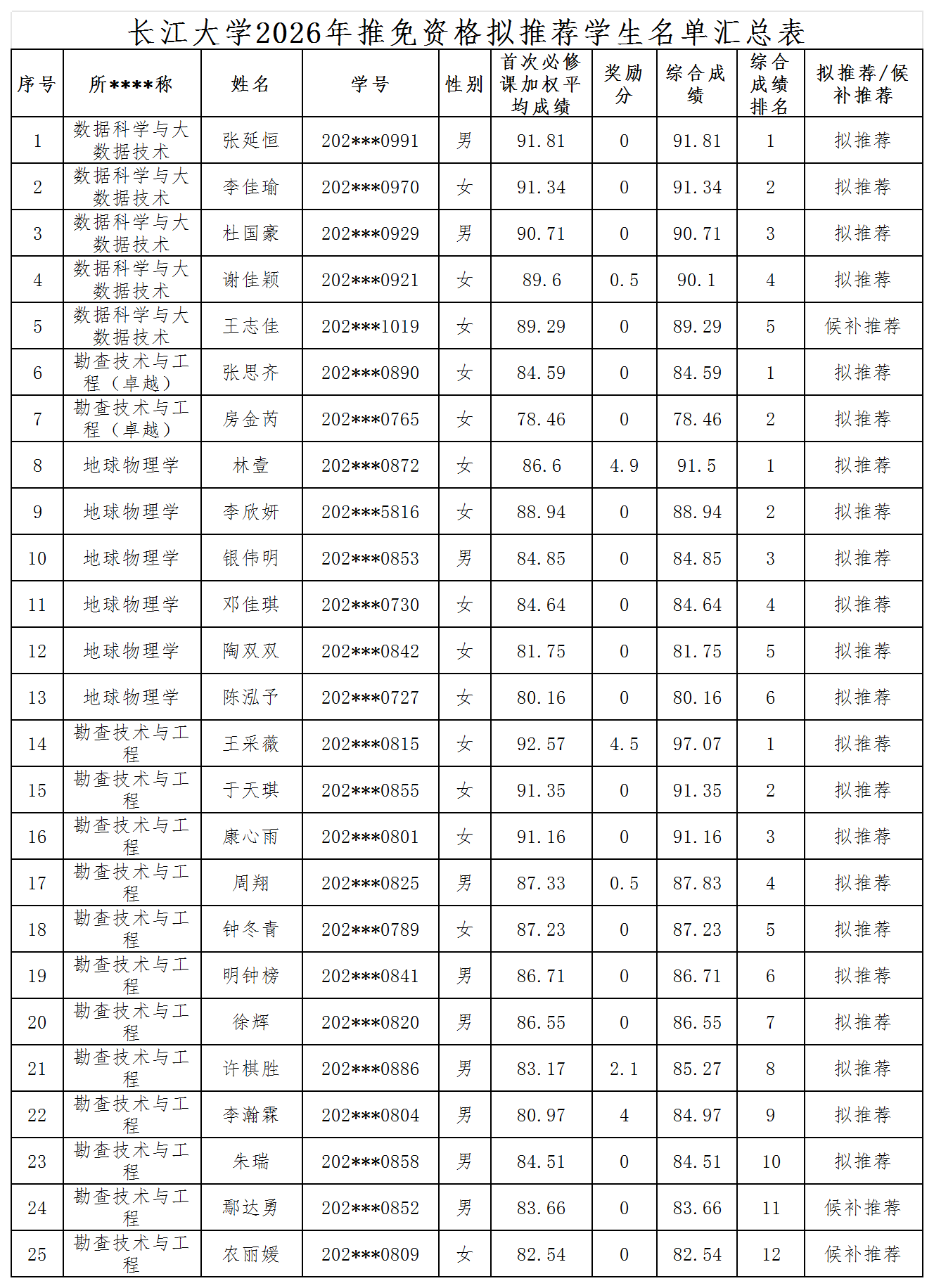 根据《长江大学推荐优秀应届本科毕业生免试攻读硕士学位研究生管理办法》(长大校发〔2025〕9号)、《关于做好推荐2026届优秀本科毕业生免试攻读硕士学位研究生工作的通知》、《关于推荐2026届优秀本科毕业生免试攻读硕士学位研究生名额分配的通知》和《地球物理与石油资源学院推荐2026届优秀本科毕业生免试攻读硕士学位研究生推免名额分配方案》要求,结合学院实际,经学生本人申请,学校相关部门和学院审核,学院推免生遴选工作小组审议通过,现将我院拟推荐2026届优秀本科毕业生免试攻读硕士学位研究生分专业按推免生名额的120%(其中20%为候补人员)进行公示。在公示期间,若拟推荐学生不符合条件或放弃推免资格,则依据候补人选的排名由候补人选依次递补,如没有递补学生的专业有学生不符合条件或放弃推免资格,则按候补学生的综合排名来依次递补。公示时间:2025年9月12日至2025年9月14日。